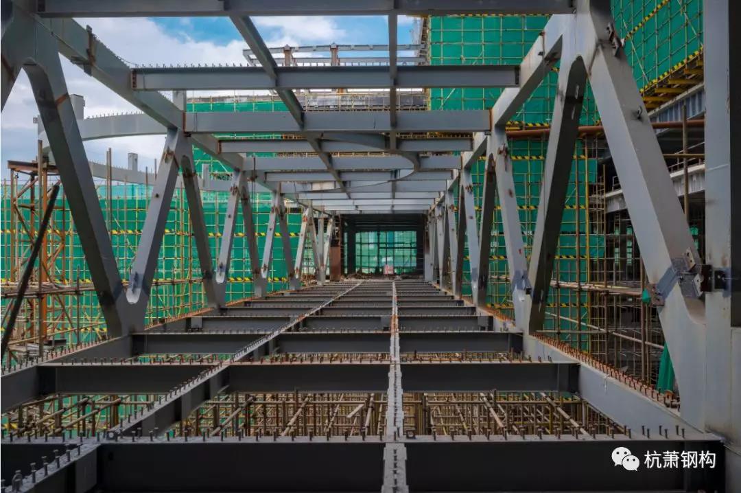 该项目具有占地面积大,钢结构工程体量大,空间大、净空高、空中连廊多、工期紧,任务重,设计异形且复杂多变,施工难度极大等特点。结构采用矩形钢管混凝土柱、钢梁带支撑框架、现浇混凝土楼板结构。