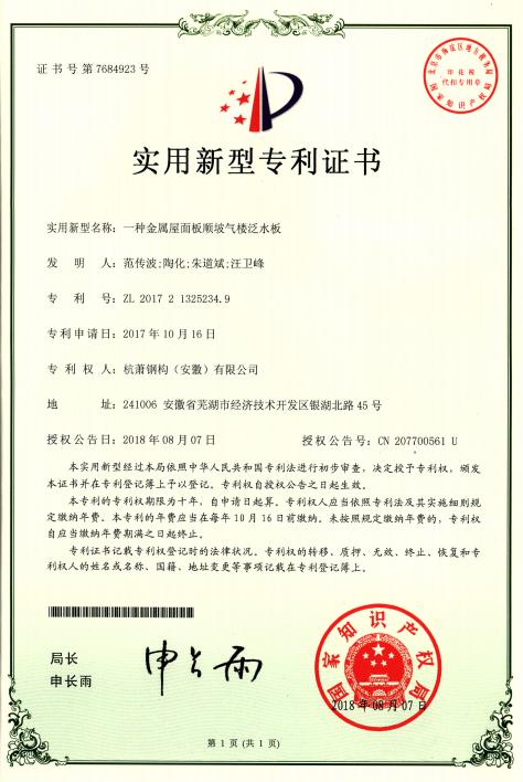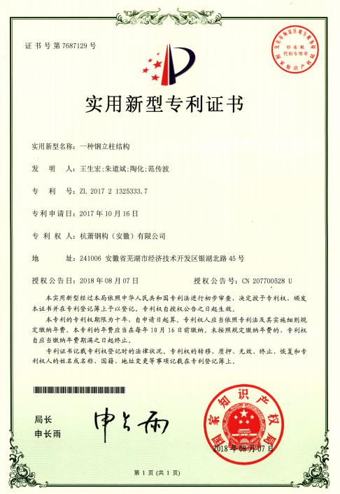 近日,半岛官方网页 (以下简称“bd游戏的官方 ”)全资子公司—— bd游戏的官方 (安徽)有限公司(以下简称“安徽杭萧”)“一种钢立柱结构”、“一种金属屋面板顺坡气楼泛水板”两项实用新型专利获得国家知识产权局正式授权。