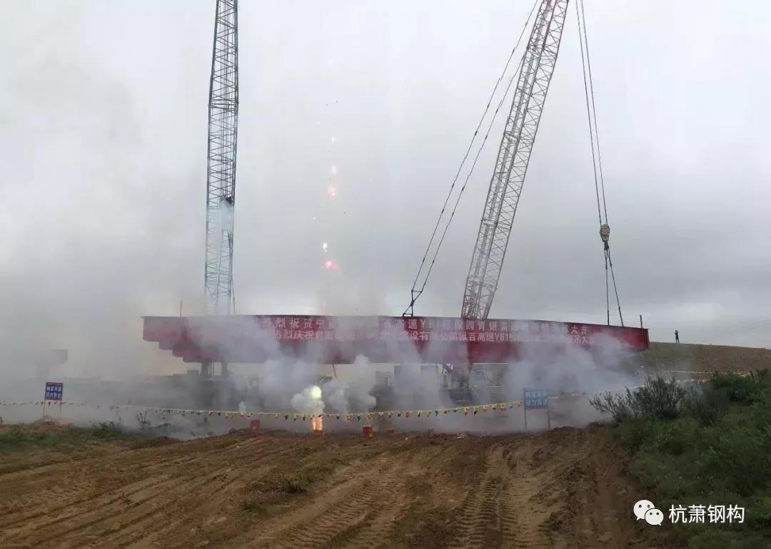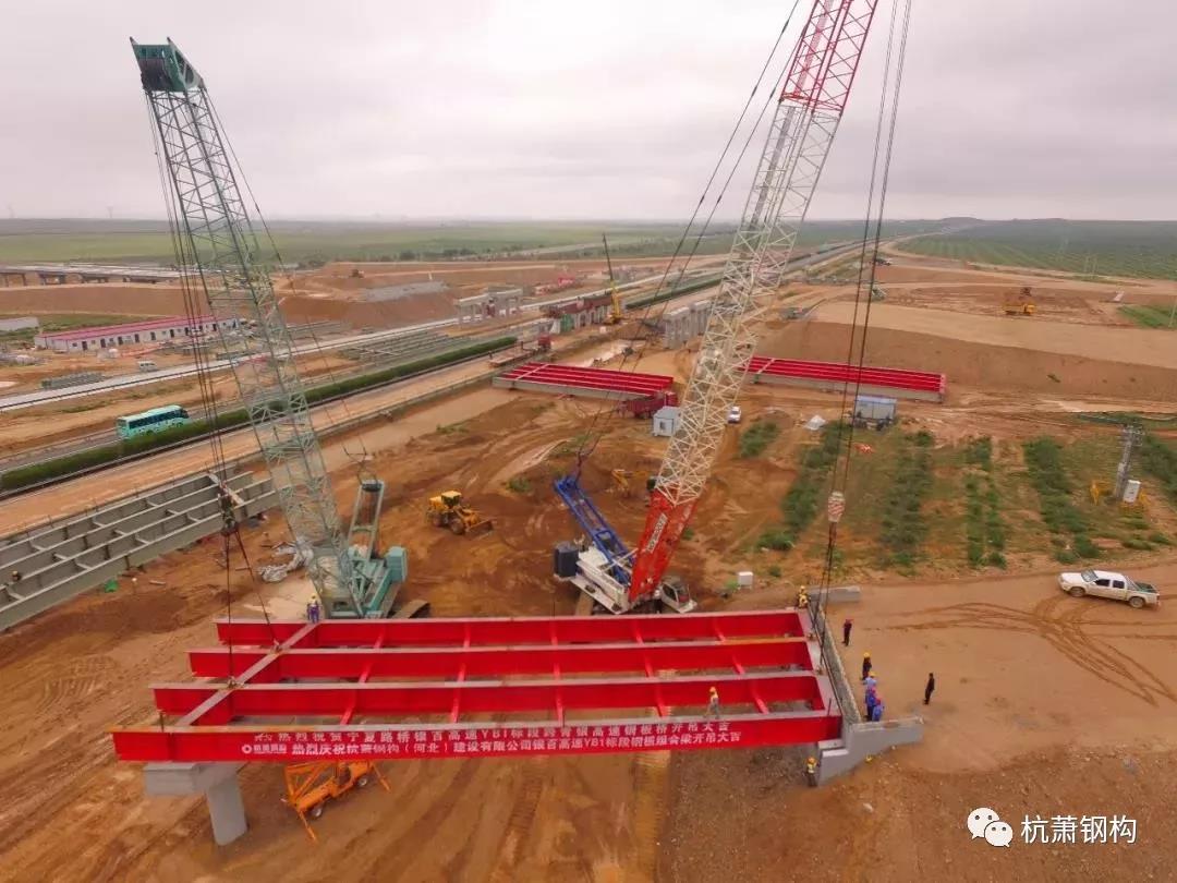 近日,在CK0+931.449 C匝道2号桥第五跨,伴随着震耳欲聋的鞭炮声,一台260T履带吊配合一台200T履带吊缓缓将钢板组合梁垂直吊起。经过技术人员与吊装人员的密切配合,钢混组合梁准确平稳的就位于橡胶支座上,标志着由半岛官方网页 (以下简称“bd游戏的官方 ”)控股子公司——bd游戏的官方 (河北)建设有限公司(以下简称“河北杭萧”)承建的银百高速宁东至甜水堡工程I合同段工程(以下简称“银百公路”)首吊顺利完成。