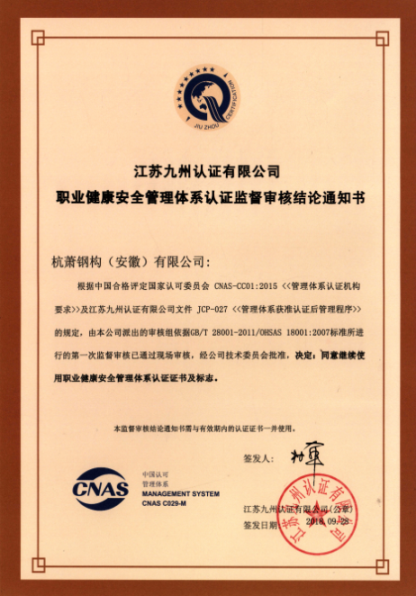 审核组依照ISO9001: 2015质量管理体系、GB/T50430-2017工程建设施工企业质量管理规范(换版升级)、ISO14001: 2015环境管理体系、OHSAS18001:2007职业健康安全管理体系对钢结构制作、安装、施工项目的整体管理控制进行审核,并对体系运行状况的有效性、充分性、整体性进行了论证。