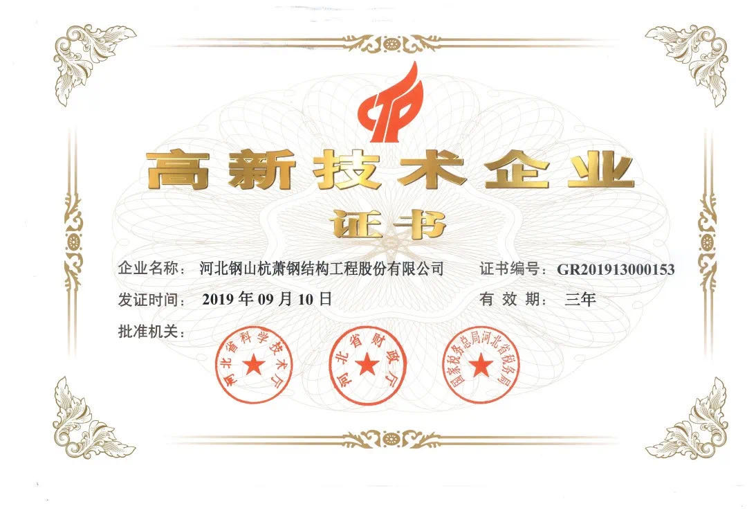 近日,根据河北省《高新技术企业认定管理办法》和《高新技术企业认定管理工作指引》的相关规定,bd游戏的官方 战略合作参股公司——河北钢山杭萧钢结构工程股份有限公司(以下简称“河北钢山杭萧”)被认定为高新技术企业,获得由河北省科学技术厅、河北省财政厅、国家税务总局河北省税务局联合颁发的《高新技术企业证书》。这一殊荣的获得,是对河北钢山杭萧研发和技术创新能力的充分肯定。