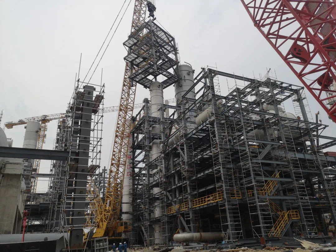 该项目位于江苏省连云港市徐圩新区连云港石化产业基地,项目建成后,将成为盛虹集团芳烃-聚酯产业链中承上启下的关键环节。山东杭萧负责该项目中1201、1202、1203、1300、1401、1402、1500、1601、1700、2600以及弧形设备平台等单体的施工详图深化设计、材料采购、构件制作、检试验;仅用时4个月完成了13472.4吨供货任务,日供货量长期维持在200吨/天,高峰时达到300吨/天,为项目施工的顺利进行奠定了基础。