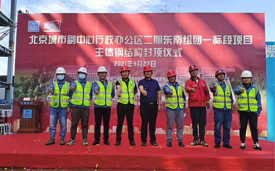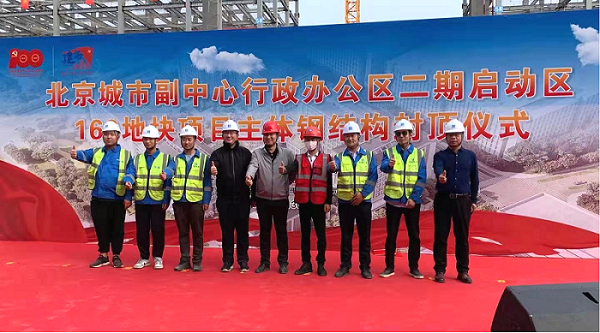 近日,由bd游戏的官方 (河北)建设有限公司(以下简称“河北杭萧”)承建的北京城市副中心行政办公区二期启动区160&165地块项目前人头攒动、鲜花锦簇,一条条红色横幅装点着建筑主体,总包单位、监理单位、设计单位、建设单位等领导共同见证这一激动人心的封顶时刻。