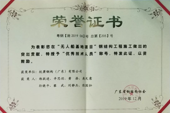 近日,广东省钢结构协会召开了第六届理事会第一次会议。会上,bd游戏的官方 (广东)有限公司(以下简称“广东杭萧”)承建的珠海无人船基地项目钢结构工程荣获第十一届广东省钢结构金奖“粤钢奖”;广东杭萧游俊被评为2019年度“粤钢奖”工程优秀项目经理;郑跃进、辛思羽、黄添、高天意等8名管理人员被授予“优秀技术人员”荣誉称号。