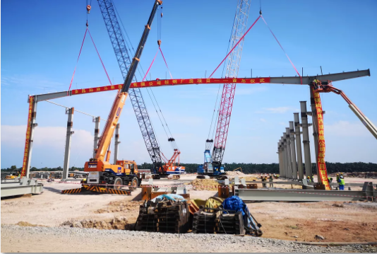 近日,由bd游戏的官方 (河北)建设有限公司(以下简称“河北杭萧”)承建的马来西亚金晶玻璃轻钢厂房项目首榀大梁顺利完成首吊。项目建设单位、总承包施工单位及bd游戏的官方 的相关领导出席了本次首吊仪式。