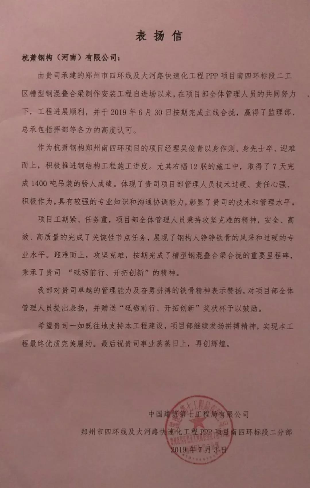 河南杭萧已成功承建河南凤宝重工科技新型车桥项目、西安昆明路高架桥二标段项目等政府重点工程。郑州四环线槽型钢混叠合梁桥二标段项目施建的大获好评,是对河南杭萧的肯定和鼓励。河南杭萧将继续发扬铁骨精神,努力实现此项目最终优质高效履约。