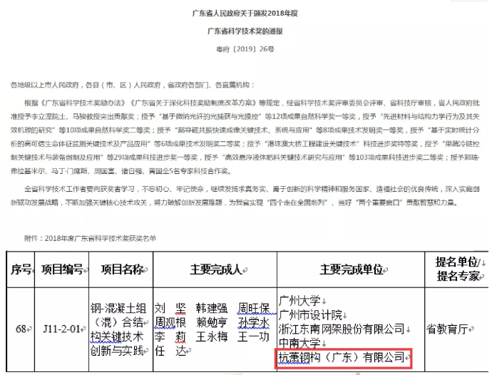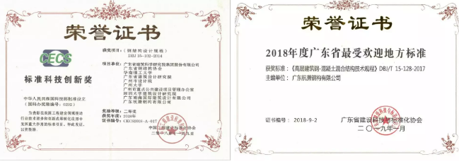 作为当地产值十强的实体企业,广东杭萧成绩显著。在政府大力支持下,早期获评国家级“高新技术企业”称号,为技术研发、工艺创新、人才引进打下了良好基础。2018年,广东杭萧获评“国家标准科技创新奖”二等奖一项,“广东省科技进步奖”二等奖一项,主编的《高层建筑钢-混凝土混合结构技术规程》DBJ/T 15-128-2017被评为“2018年度广东省最受欢迎地方标准”奖一项,取得实用新型专利10项。