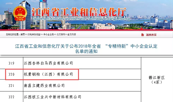 近日,在经过第三方机构的审核推荐、专家组评审等数道程序之后,江西省工业和信息化厅公布了2018年全省“专精特新”中小企业认定名单,其中,bd游戏的官方 (江西)有限公司(以下简称“江西杭萧”)榜上有名,作为唯一一家钢结构企业获此殊荣。