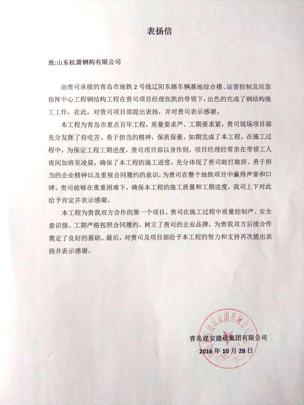 近日,由山东bd游戏的官方 有限公司承建的青岛市地铁2号线辽阳东路车辆基地综合楼、运营控制及应急指挥中心工程钢结构顺利封顶,工程钢结构施工得到总包及监理单位的一致好评,总包青岛建安建设集团有限公司在该工程完工后发来表扬信,在信中充分感谢了山东杭萧在工程建设中的付出和做出的贡献。