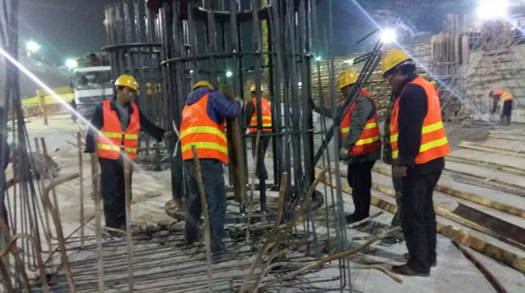 济青高铁机场站车站采用明挖法施工,主体结构宽度14.62~39.2m,结构底埋深约20.31m。其柱采用φ1200*25/φ1000*25直缝钢管混凝土柱,共171支,高度约14米,单根重量约15吨,总重3000余吨。每支钢管柱由25mm厚钢板卷管制作而成。钢柱板厚最大为70mm。加工制作完成后整支运输至施工现场。锚栓采用24支Q390B材质M60锚栓,工厂加工组立后运输至现场,利用塔吊进行安装。由于工程时间紧,且精度要求高,山东杭萧成立专项小组,细化加工制作方案,结合TOC管理理论,分3个区域进行加工制作,缩短交货时间。现场同样分为3个区,采用75吨履带吊吊装钢柱,待筏基混凝土达到设计强度后,将履带吊开入基坑内,分区段整支吊装。