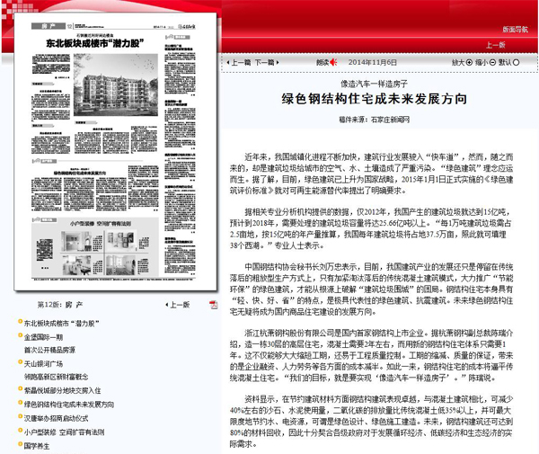 2014年11月6日,《石家庄日报》第12版《房产》报道:《像造汽车一样造房子 绿色钢结构住宅成未来发展方向》。
