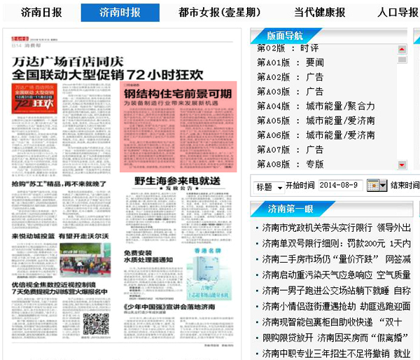 2014年10月31日,《济南时报》第B14版《消费帮》报道:《钢结构住宅前景可期 为装备制造行业带来发展新机遇》。