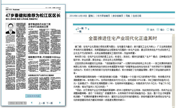 2014年11月18日,《东方早报》第A20版《财经·重点》报道:《全面推进住宅产业现代化正逢其时 》。