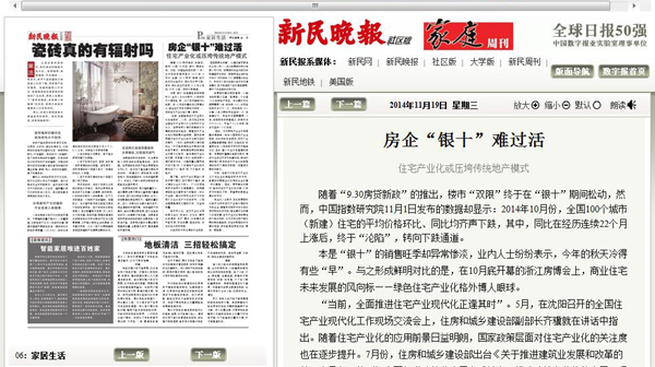 2014年11月19日,《新民晚报》第P06版《家居生活》报道:《房企“银十”难过活 住宅产业化或压垮传统地产模式》。