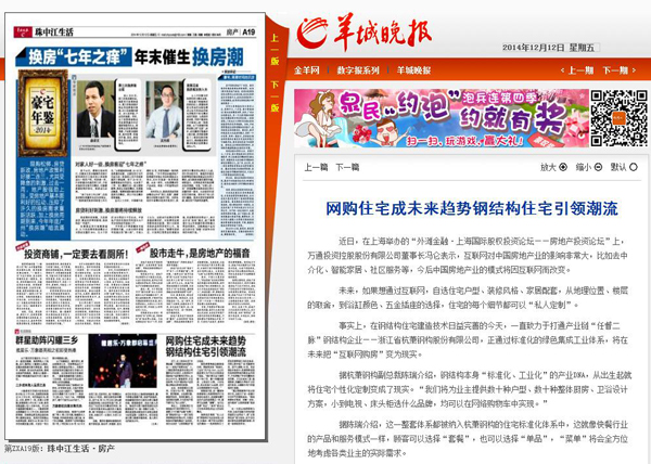 2014年12月12日,《羊城晚报》第A19版《房产》报道:《网购住宅成未来趋势 钢结构住宅引领潮流》。