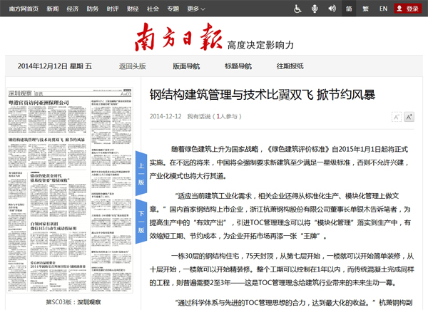 2014年12月12日,《南方日报》第A03版《深圳观察》报道:《钢结构建筑管理与技术比翼双飞 掀节约风暴》。