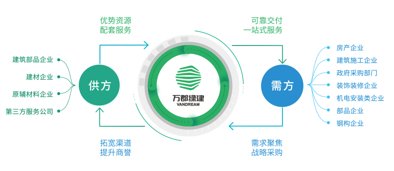万郡绿建通过透明交易、一站式采购、信息与大数据共享为采购降低成本,提高效率;通过全方位展示、多样化互动、供应链金融为供应商拓宽渠道,提升商誉。同时万郡绿建通过线上网站、交易平台、产品体验中心和公众号三大服务平台为专业的供应链供需方交易保驾护航。