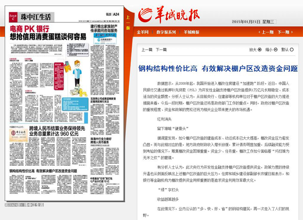 2015年1月21日,《羊城晚报》第A24版《珠中江生活》报道:《钢构结构性价比高 有效解决棚户区改造资金问题》。