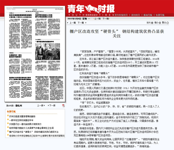 2015年2月9日,《青年时报》第06版《微杭州》报道:《棚户区改造攻坚“硬骨头” 钢结构建筑优势凸显获关注》。