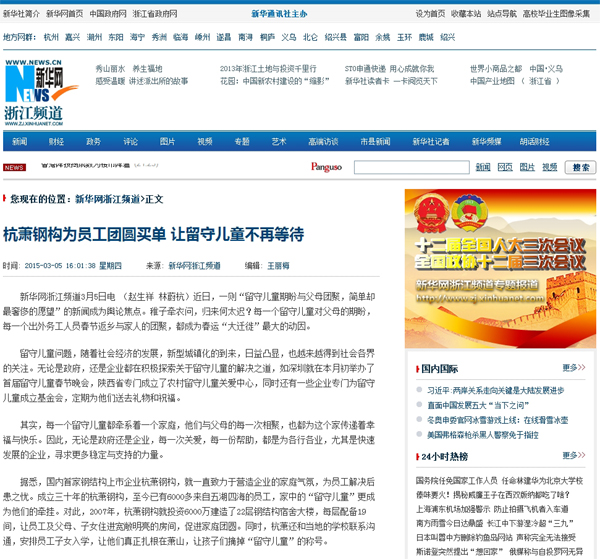 2015年3月5日,《新华网浙江频道》报道:《bd游戏的官方 为员工团圆买单 让留守儿童不再等待》。