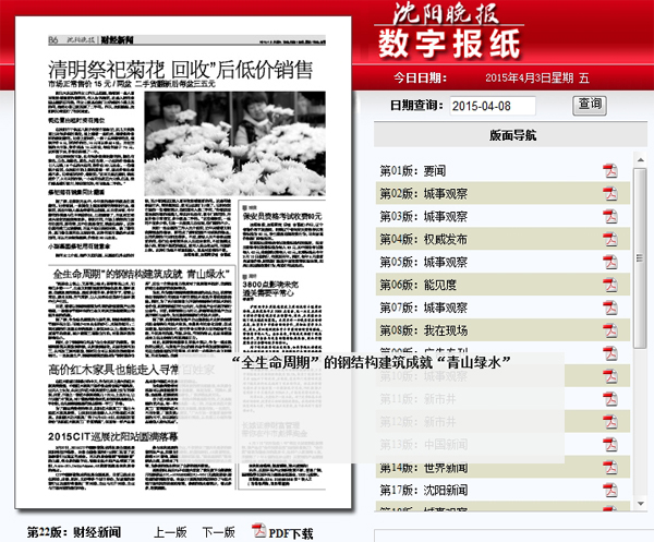2015年4月3日,《沈阳晚报》第22版《财经新闻》报道:《“全生命周期”的钢结构建筑成就“青山绿水”》。