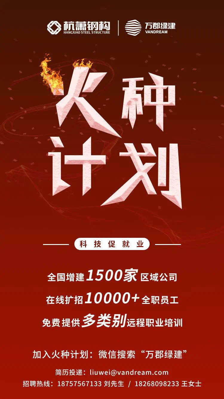 以己之力,积跬步于千里。2020年,万郡绿建将持续发挥自身优势,聚力推动全国绿色建筑产业互联网的发展,加速建筑业的转型升级。近期,万郡绿建全面启动“火种计划”,旨在全国范围内建立1500个销售管理公司,招募近万个岗位,以全国的销售管理公司为着力点,为建筑全产业链供需方企业提供一站式服务,降低采购成本,提高采购效率,从助力建筑企业实现转型升级出发,推动建筑业向智能化、数字化发展。