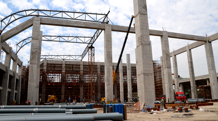The longitudinal axis span is 99 meters, the horizontal axis span is 80.4 meters, elevation of concrete column top is 21 meters, elevation of eaves is 24 meters, elevation of roof ridge is 24.9 meters. The biggest span of single truss is 45 meters, the heaviest weight is 19 tons. And the largest section of circular pipe is p402 x 30, minimum section is p140 x 8. The material of main structure (pipe truss) is Q345B. Stacking and assembling, hoisting of material are carried out on the roof of the basement.