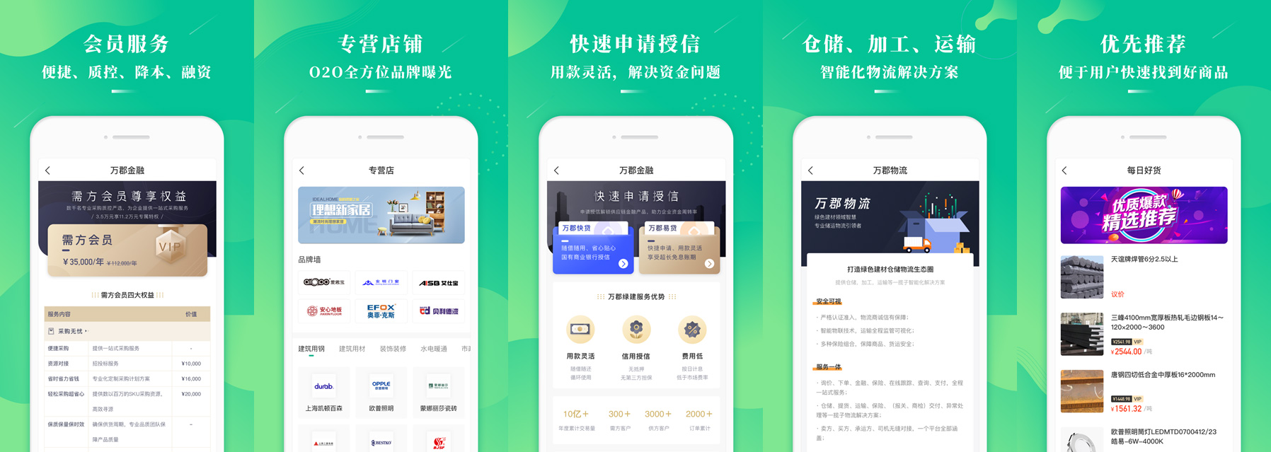 在万郡易采APP,用户轻触手指,即可随时随地尽览全平台数十万SKU,并可畅享全天候选型选样、一站式采购以及高效的资源对接,无论是在出差途中还是回家路上,建筑建材采购人员打开万郡易采就能随时随地选型选样、搜索产品、下单交易,随时随地畅享移动化交易的便捷。对于供方客户,更可通过万郡易采APP为公司产品赢得更多曝光机会,让优质商品不再销路难寻,有物流需求或物流资源的用户,还可通过万郡易采APP的一键对接服务,与万郡绿建共同打造绿色建材仓储物流生态圈。此外,万郡易采APP的发现频道还为广大行业从业人员提供了丰富的资讯阅读功能,从行业资讯到国家政策、从活动信息到建材知识,为用户打造了专属的行业”头条“,更有丰富的供应链金融服务产品,能够更加快捷的解决建筑、建材行业供需企业融资难的问题,降低企业融资成本,加快资金周转速度,帮助企业赢得更多收益。