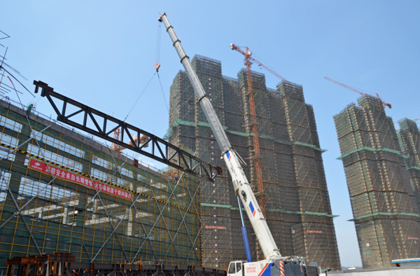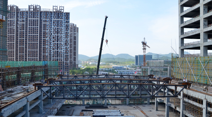承建的青山湖科技城越秀城市综合体(一期)A1区酒店裙房宴会厅100吨桁架高空组合滑移成功。