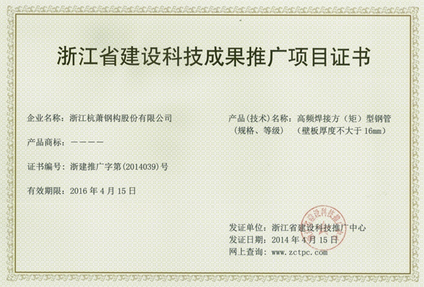 引进美国全套先进生产设备的“高频焊H型钢”和“高频焊矩(方)型钢管”两个新产品,从产品的研发、生产工艺控制要点、应用技术特点以及工程应用实例和用户使用反馈情况等方面作了汇报,专家们仔细审阅了浙江省冶金产品质量检验站提供的检测报告等有关技术资料,察看了新产品样品、生产过程录像和工程应用的实例照片资料,经过深入的质询和讨论,各位专家对杭萧的高频焊产品给予了高度的评价——“工艺先进、质量可靠、应用性强”。最后一致认为:杭萧高频焊矩(方)型钢管具有截面规格灵活,成型焊缝少等优点。产品经过浙江省冶金产品质量检验站检测,所检性能指标符合JG/T 178-2005《建筑结构用冷弯矩形钢管》标准的相关要求;高频焊H型钢具有自重轻,截面规格灵活,节省钢材,经济性好等优点。产品经过浙江省冶金产品质量检验站检测,所检性能指标符合JG/T 137-2007《结构用高频焊接薄壁H型》标准的相关要求。杭萧的高频焊产品生产规模大、工艺优良、设备先进、生产效率高、在线同步检测、产品质量稳定,质量管理体系通过ISO9001认证,环境管理体系通过ISO4001认证。产品经用户使用,反映良好。并一致同意颁发“浙江省建筑科技成果推广项目证书。”