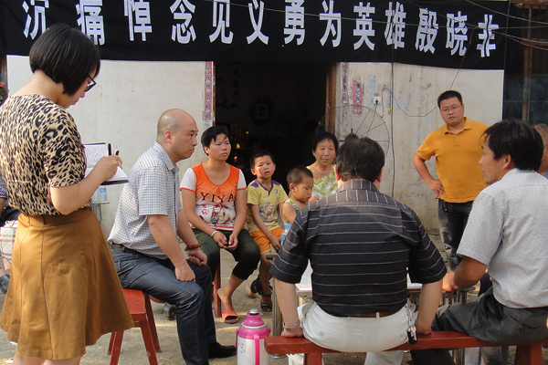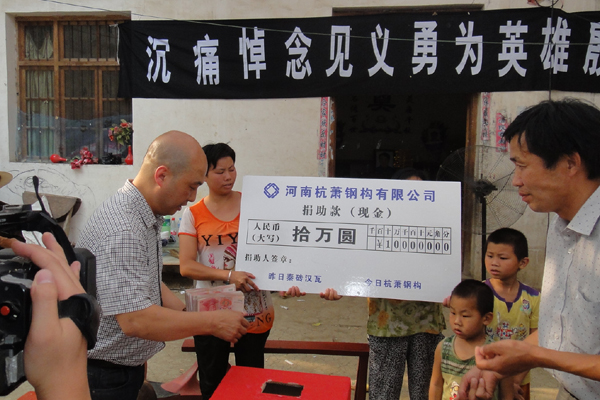 有限公司总经理孙伟从洛阳来到英雄殷晓非的家看望慰问英雄家属并带去了10万元的慰问金,孙总还承诺,这10万元只是暂时解决家里的燃眉之急,以后还会解决三个孩子上学问题和就业问题。随后,孙总给殷晓非的妻子留下联系方式,说以后有什么情况都可以联系他。
