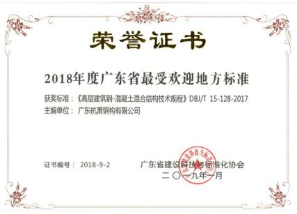 浙江在线3月5日讯(浙江在线通讯员 刘信怡)近日,由半岛官方网页 控股子公司——bd游戏的官方 (广东)有限公司(以下简称“广东杭萧”)和广东省建筑设计研究院主编的广东省工程建设地方标准——《高层建筑钢-混凝土混合结构技术规程》DBJ/T 15-128-2017被广东省建设科技与标准化协会评为“2018年度广东省最受欢迎地方标准”。