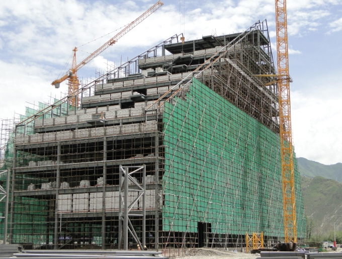 拉萨圣地天堂洲际大饭店四栋钢结构酒店建筑面积9.8万平方,A栋结构标高59.27米,B栋结构标高72.606米。