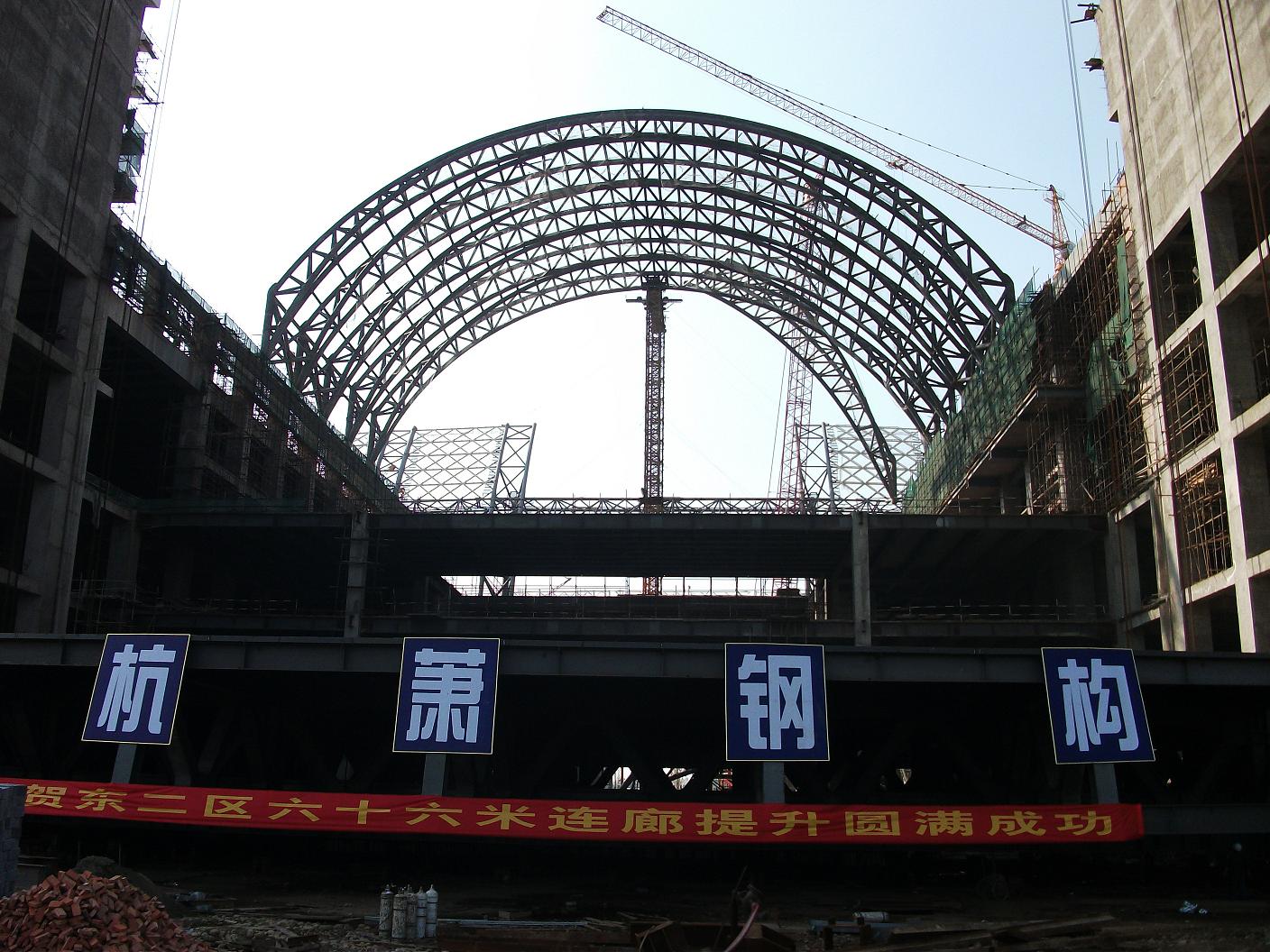 成都新世纪环球中心东二区13-14层连廊桁架于2011年11月9日试提成功,于2011年11月10日上午9:00正式提升,下午16:30时提升到位。13-14层连廊桁架重量1300吨,在16-18层钢框架2011年10月5日提升完成后,于2011年11月5日全部具备提升条件,全部拼装用时30天,由于业主增加13层马道,故提升时间变更为2011年11月10日。