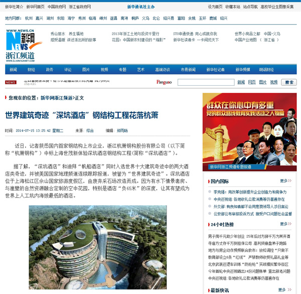 2014年7月15日,《新华社浙江频道》报道:《世界建筑奇迹“深坑酒店”钢结构工程花落杭萧》