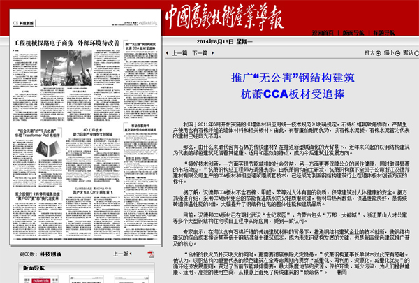 2014年8月18日,《中国高新技术产业导报》C8版《科技创新》报道:《推广“无公害”钢结构建筑 杭萧CCA板材受追捧》