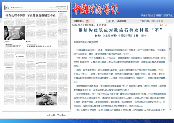 2014年8月23日,《中国经济导报》第C02版《生态文明》报道:《钢结构建筑应对致癌石棉建材说“不”》。