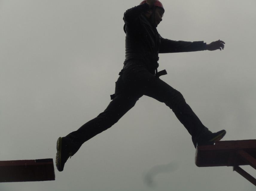 8米高空断桥更多的是个人挑战的项目。要求队员克服内心的恐惧去挑战自己的舒适区。人都喜欢在舒适区中呆着,都不愿爬到七八米的高空去挑战断桥,但是舒适区是不利于个人发展的。所以要鼓励人到发展区去体验突破自我的感觉,当然随后带来的成功的愉悦感和成就感是最让人心动的。这种成就的感觉要成为每个人追求成功的动力,真正找到自己想要的。