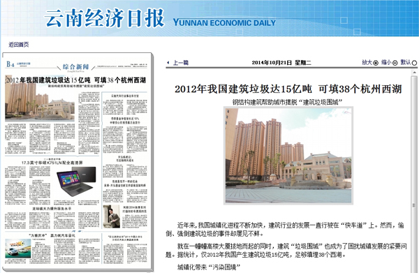 2014年10月21日,《云南经济日报》第B4版《综合新闻》头条报道:《2012年我国建筑垃圾达15亿吨 可填38个杭州西湖——钢结构建筑帮助城市摆脱“建筑垃圾围城”》