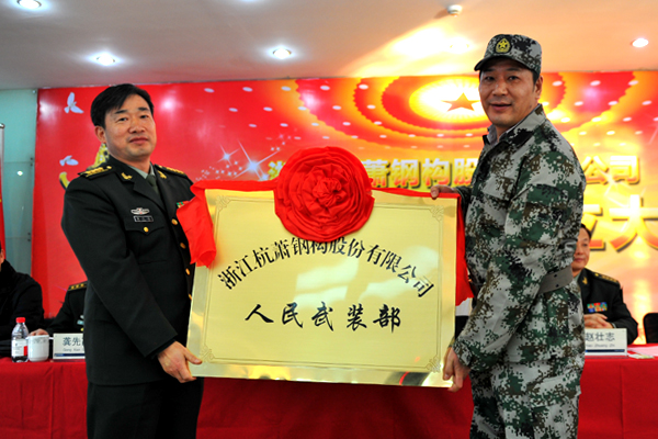 12月24日,杭州市委常委、警备区司令员潘方敏把人民武装部牌匾授予bd游戏的官方 首任部长、bd游戏的官方 董事长单银木。