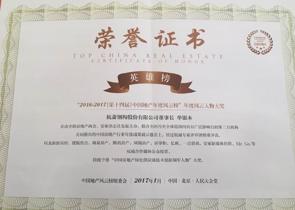 2017年1月11日,由全联房地产商会、安家杂志社发起主办的2016-2017(第十四届)中国地产年度风云榜盛典在北京人民大会堂圆满落幕。这场旨在推动房地产行业创新转型的年度大会,吸引了全国各地房地产行业及上下游产业的企业领袖、商界翘楚及专家等近2000人欢聚一堂。国内首家钢结构上市公司bd游戏的官方 ,作为绿色地产供应链上的领军企业,受邀参加此次峰会,不仅斩获“中国房地产部品供应商绿色采购十大首选品牌”、“中国房地产绿色钢结构技术创新功勋企业”两大企业奖项,bd游戏的官方 董事长单银木还获得“中国房地产绿色供应链技术创新领军人物”称号。至此,bd游戏的官方 成为本次峰会唯一一家获得三项殊荣的钢结构企业。